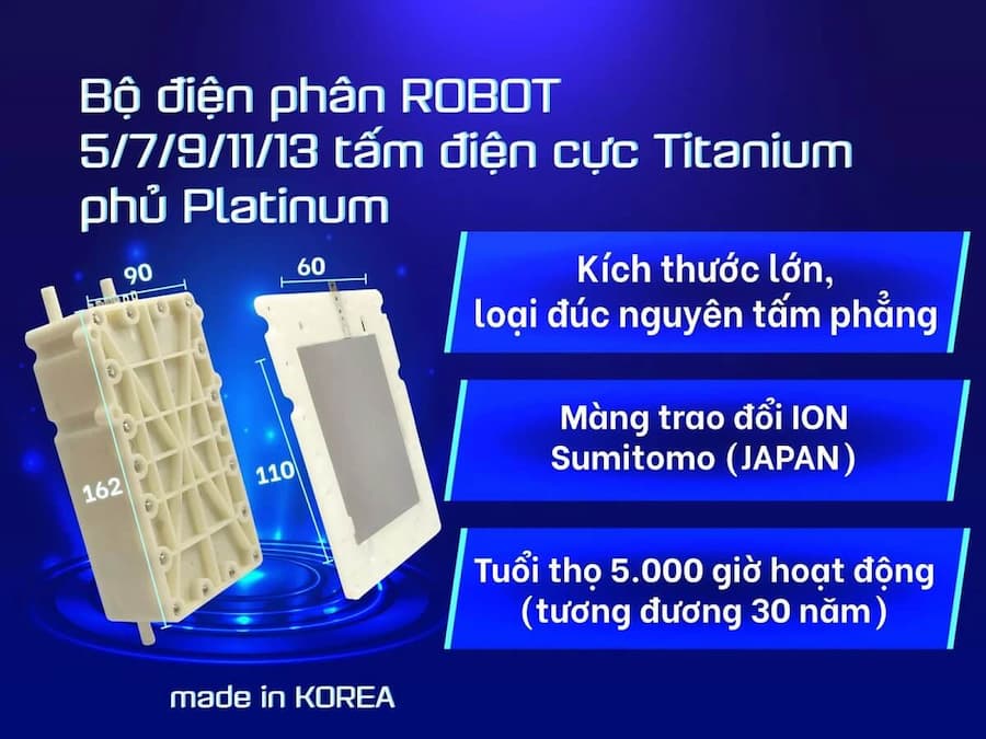 11 tấm điện cực: Đây là một trong những điểm nổi bật nhất của máy. Với 11 tấm điện cực Titanium phủ Platinum đúc nguyên tấm, sản xuất tại Hàn Quốc, máy có khả năng tạo ra các loại nước với chỉ số Hydrogen và ORP (chống oxy hóa) cao, tối ưu cho sức khỏe.