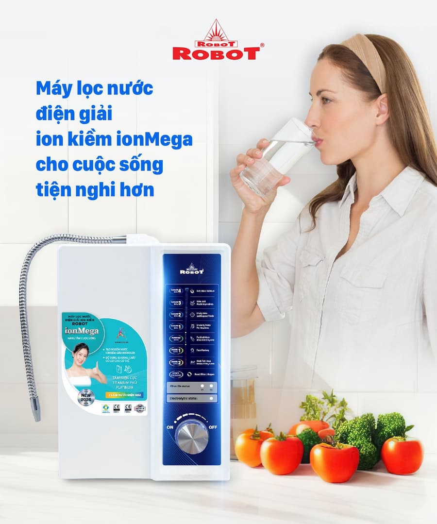 -35%Máy lọc nước ION Kiềm Robot IONMEGA 117 là một thiết bị lọc nước điện giải cao cấp của thương hiệu ROBOT, được thiết kế để tạo ra nhiều loại nước có độ pH khác nhau, phục vụ đa dạng nhu cầu sử dụng trong gia đình. IONMEGA 117 thiết kế mới, độc đáo tiết kiệm với đầy đủ công năng của một máy điện giải ion kiềm đạt chuẩn quốc tế. ROBOT ionMega được thiết kế tối giản, nhỏ gọn, thao tác lấy nước trong một lần chạm, đáp ứng nguồn nước điện giải ion kiềm 24/24 tốt cho sức khỏe & sinh hoạt. Robot IONMEGA 117 là sản phẩm cao cấp, tích hợp nhiều công nghệ và tính năng nổi bật để mang lại nguồn nước ion kiềm chất lượng cao. Dưới đây là những điểm cốt lõi về công nghệ và tính năng của máy: