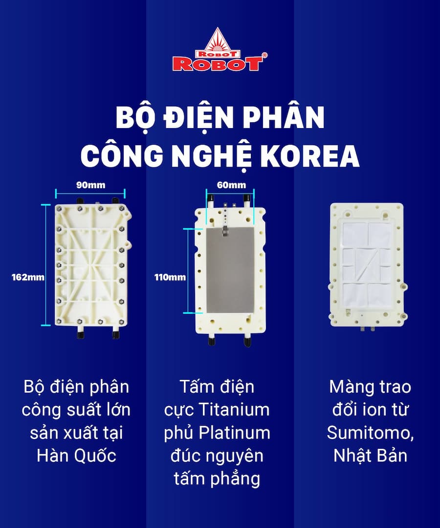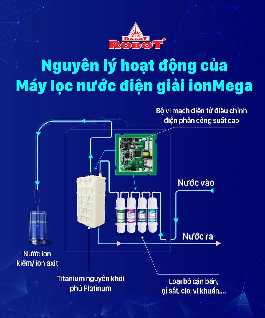 Công nghệ điện phân Hàn Quốc thế hệ mới: Đây là trái tim của máy. ROBOT IONMEGA 117 sử dụng công nghệ điện phân tiên tiến từ Hàn Quốc, cho phép tách nước thành ion H+ và OH- để tạo ra các loại nước với dải pH rộng. Đặc biệt, quá trình điện phân này hoàn toàn không sử dụng hóa chất hay chất xúc tác, đảm bảo nguồn nước tinh khiết và an toàn.