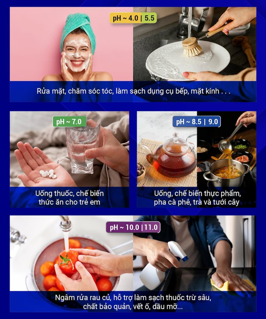 Tạo 7 loại nước với dải pH rộng (4.0 - 11.0): Đây là tính năng linh hoạt, đáp ứng mọi nhu cầu sử dụng trong gia đình, từ nước uống hàng ngày, nấu ăn, pha sữa, cho đến làm đẹp và vệ sinh: