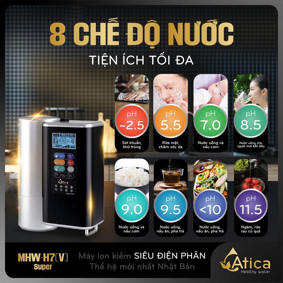 -16%Máy lọc nước ion kiềm siêu điện phân Atica Super MHW-H7(V) là một sản phẩm cao cấp từ Nhật Bản, sản xuất bởi tập đoàn Hitachi Maxell. Điểm nổi bật nhất của dòng máy này là công nghệ siêu điện phân (Ultra Electrolysis), giúp tạo ra dải pH rộng mà không cần dùng dung dịch tăng cường điện ly. Atica SUPER MHW-H7(V) là sản phẩm thế hệ mới nhất tại Nhật Bản và duy nhất trên thế giới sở hữu công nghệ SIÊU điện phân cải tiến, kết hợp ưu điểm của các dòng máy lọc cao cấp trên thị trường. Không cần sử dụng 2 buồng điện phân hay dung dịch tăng cường điện ly, Atica Super MHW-H7(V) vẫn có thể tạo ra đến 8 loại nước với dải pH dao động từ ~2.5 đến 11.5, Hydrogen lên đến 1300ppb và kích thước bộ lọc khủng với 12000 lít.