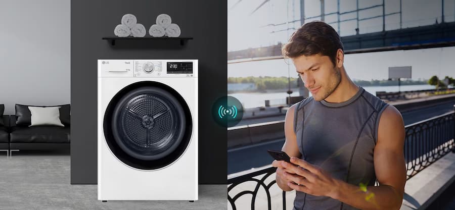 Smart ThinQ™: Kết nối và điều khiển máy sấy từ xa qua ứng dụng LG ThinQ trên điện thoại thông minh. Bạn có thể khởi động chu trình sấy, theo dõi tiến độ, tải thêm chương trình sấy mới hoặc nhận thông báo khi quần áo đã sấy xong, ngay cả khi bạn không ở nhà.
