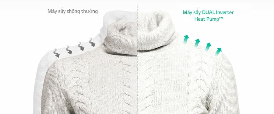 Công nghệ Dual Inverter Heat Pump™: Đây là công nghệ sấy bơm nhiệt tiên tiến của LG, giúp sấy quần áo ở nhiệt độ thấp hơn, bảo vệ sợi vải khỏi bị co rút, hư hại và phai màu. Đồng thời, công nghệ này còn tối ưu hóa hiệu quả năng lượng, giúp tiết kiệm điện đáng kể (đạt tiêu chuẩn năng lượng A+++).