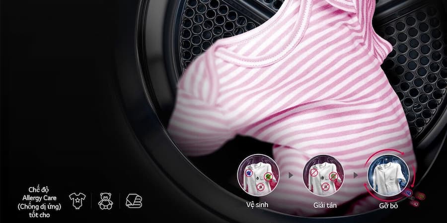 Chăm sóc dị ứng (Allergy Care): Với chu trình sấy đặc biệt này, máy có khả năng loại bỏ tới 99.9% vi khuẩn và mạt bụi gây dị ứng, được chứng nhận bởi Hiệp hội Dị ứng Anh (BAF). Điều này đặc biệt hữu ích cho các gia đình có trẻ nhỏ hoặc người có làn da nhạy cảm.