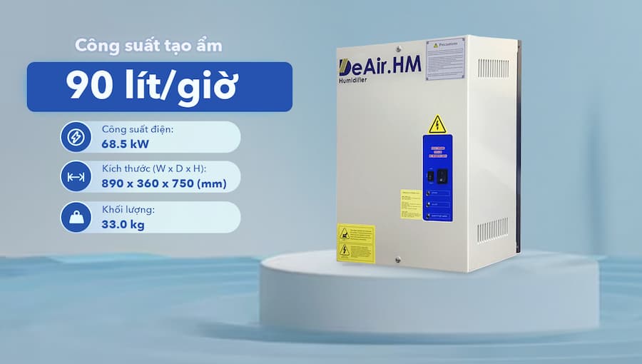 Công suất tạo ẩm: 90 kg/giờ (tương đương 90 lít nước mỗi giờ), phù hợp với các không gian lớn và yêu cầu độ ẩm cao.