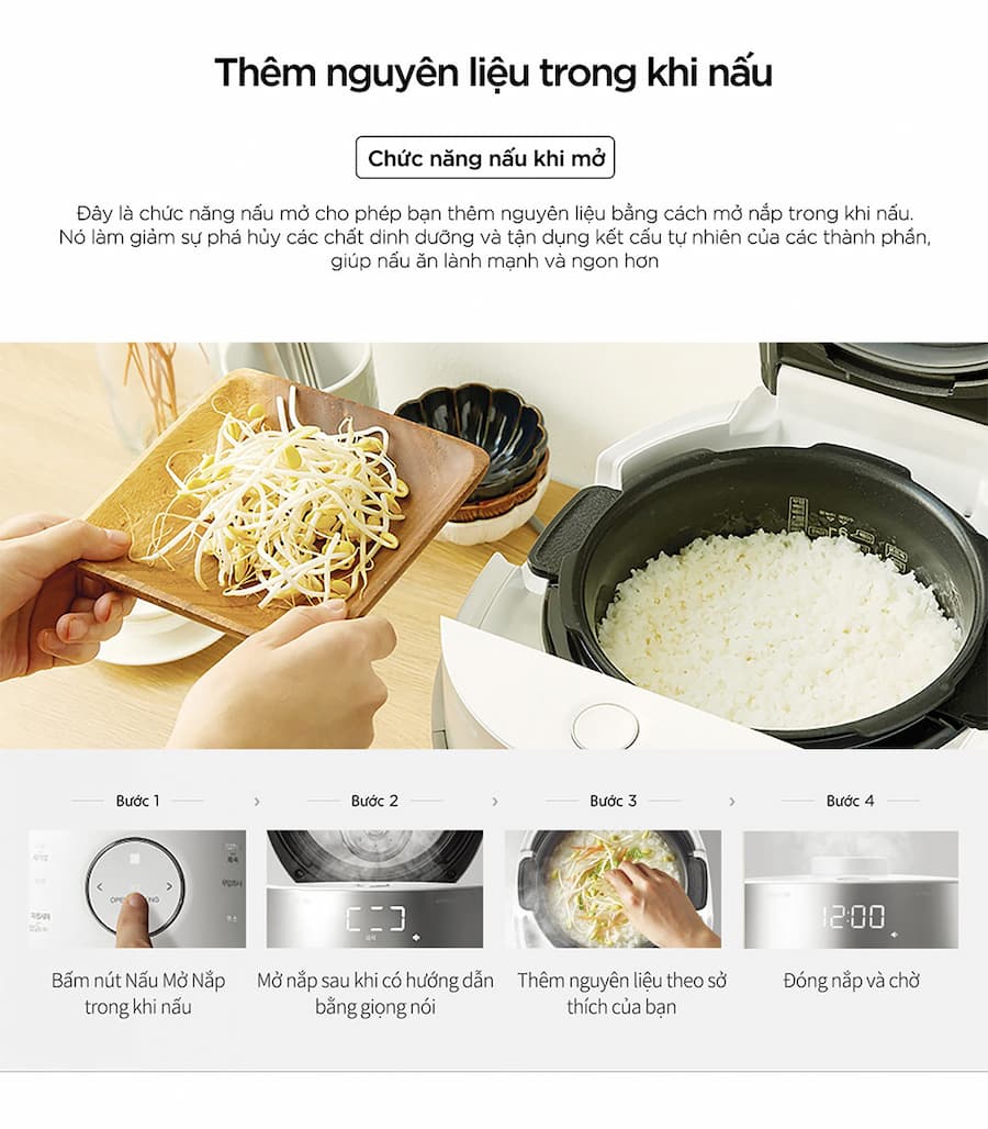 Trên nồi cơm điện Tiwn Pressure Cuckoo LHTR1010 có một điểm mà hầu hết những nồi cơm cao tần khác không có, đó là khả năng thêm nguyên liệu vào nồi ngay trong khi nấu. Điều này sẽ giúp tránh việc bỏ sót các nguyên liệu, tiết kiệm thời gian khi không phải nấu lại từ đầu hay thực hiện đúng các trình tự trong nấu ăn để cho các món ăn được ngon hơn.