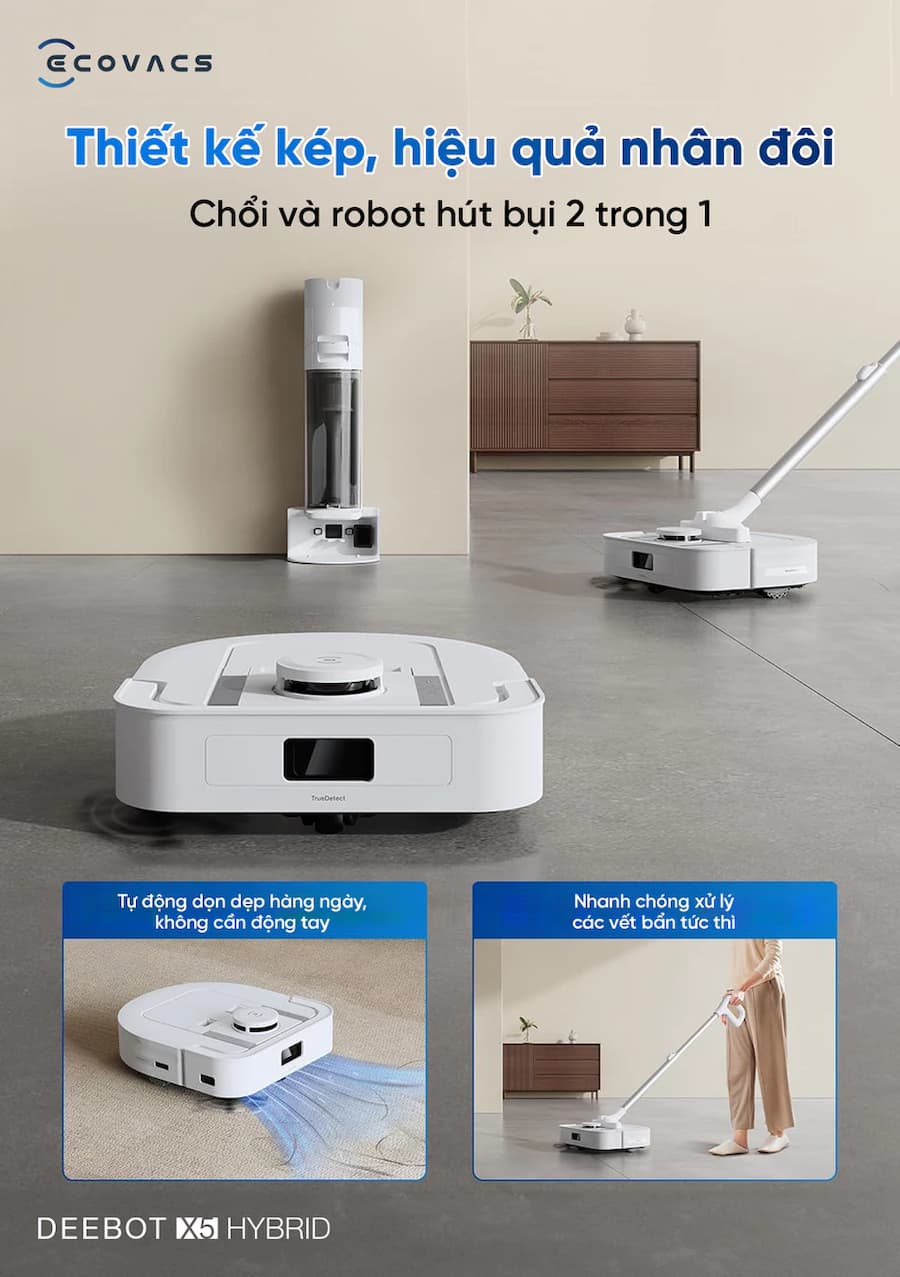 DEEBOT X5 HYBRID | LẮP LÀ SẠCH, CHỌN TỐI ƯU! Siêu phẩm “2-trong-1” kết hợp hoàn hảo giữa robot hút bụi thông minh và máy hút bụi cầm tay tiện lợi, cho phép chuyển đổi linh hoạt chỉ với một thao tác đơn giản. Hơn thế nữa, Deebot X5 HYBRID giúp bạn tiết kiệm thời gian & công sức dọn dẹp mỗi ngày, đặc biệt an tâm hơn khi để thú cưng nô đùa khắp sàn không mệt, không bụi, không lo rối. 👉 Robot hút bụi Ecovacs Deebot X5 Hybrid – Giải pháp làm sạch toàn diện cho mọi góc nhà. Lắp vào là chạy, chọn rồi là mê!
