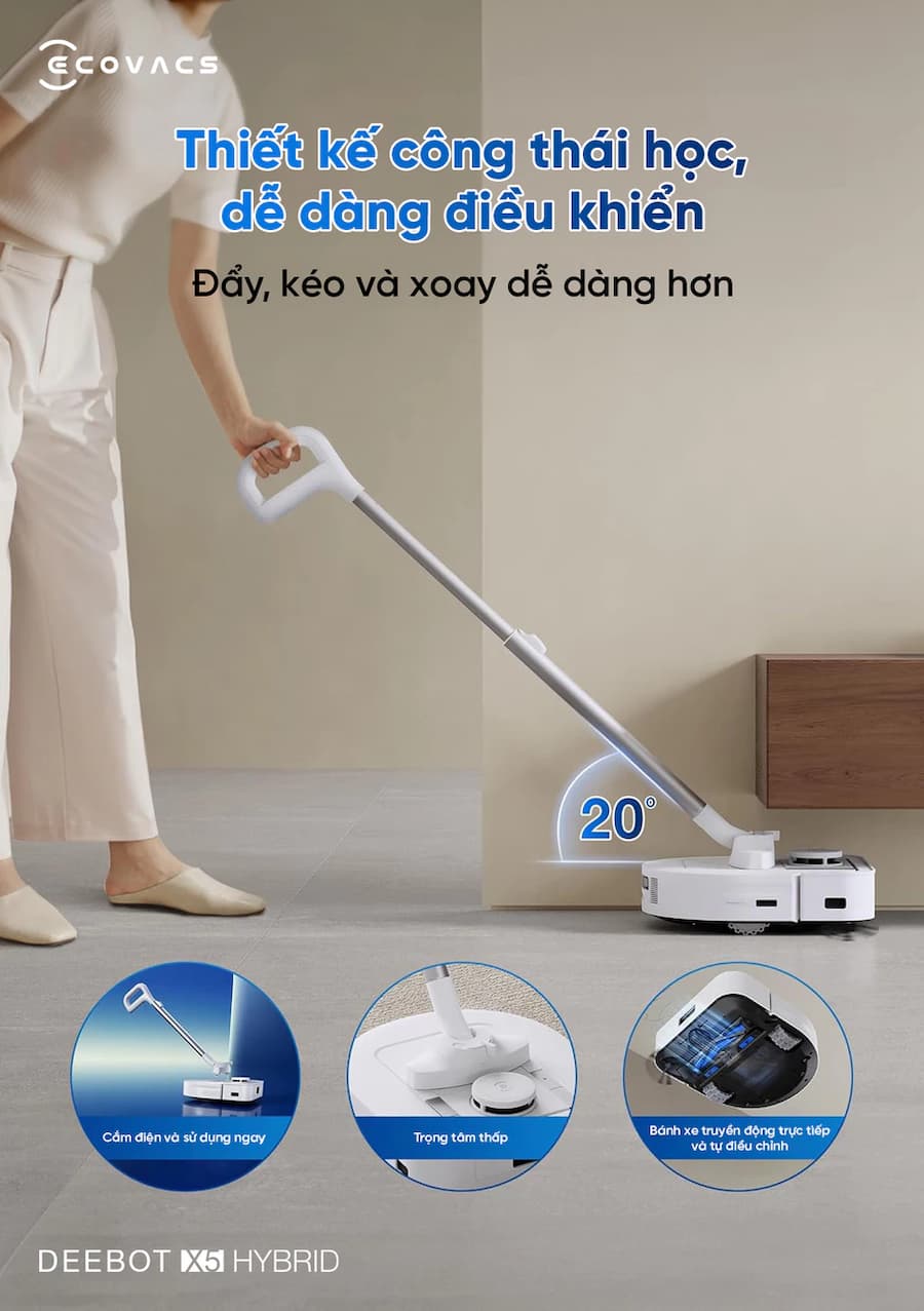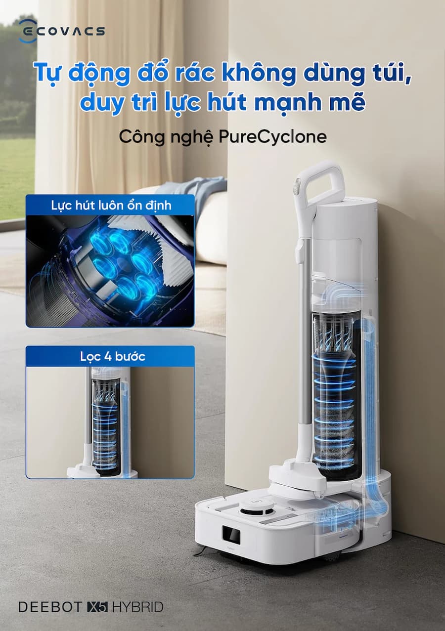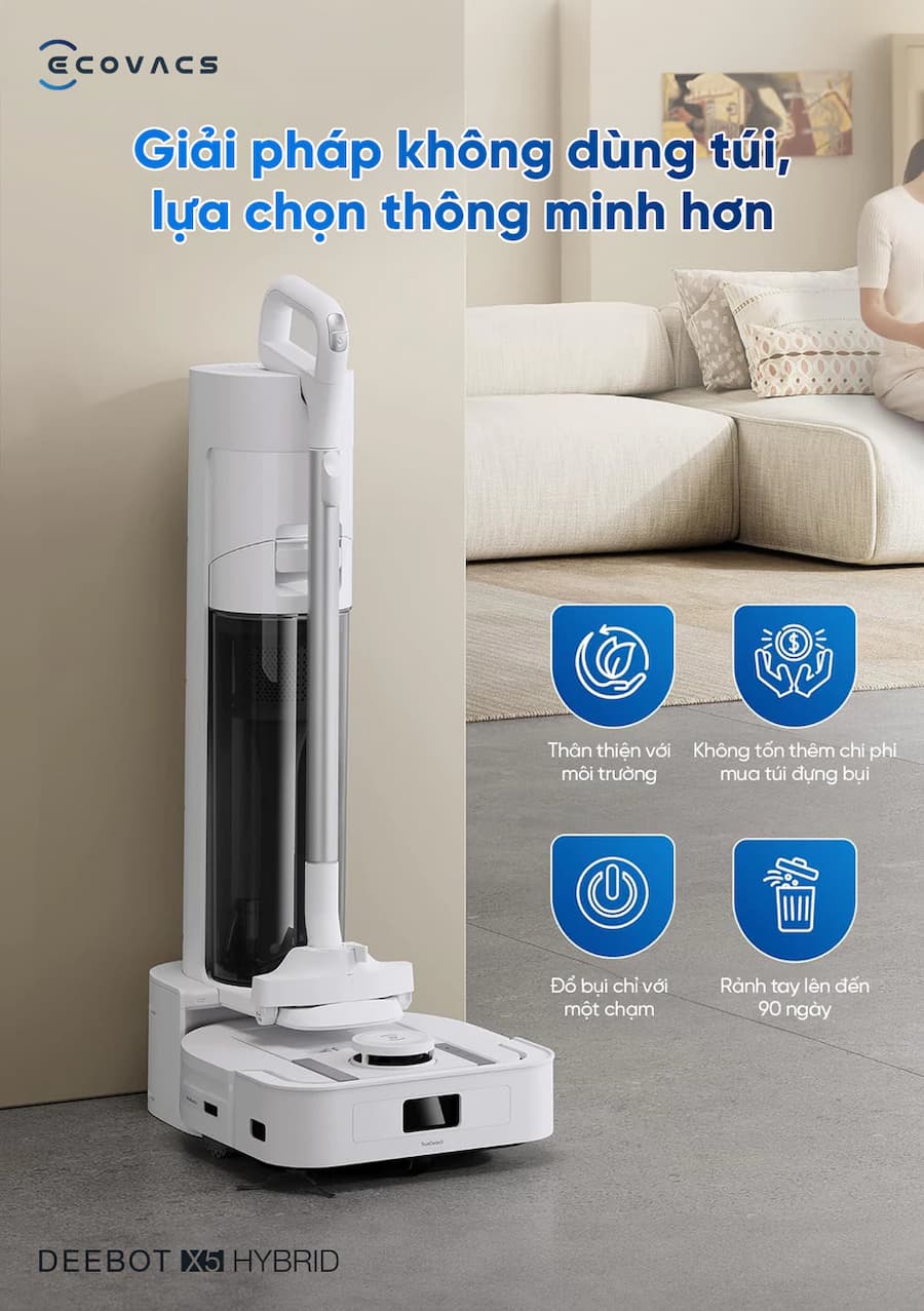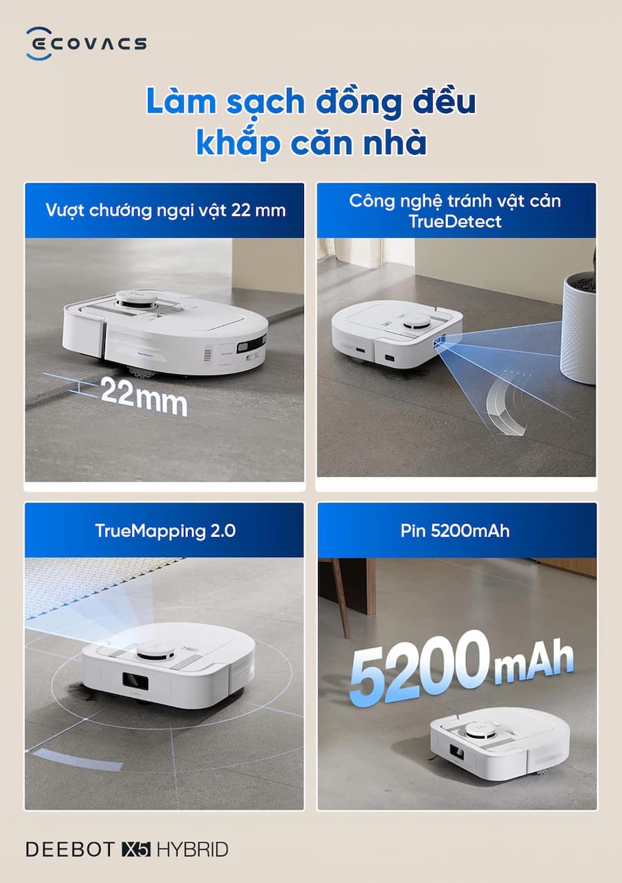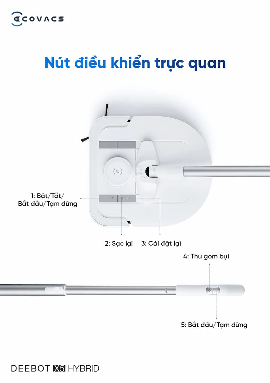 Lưu ý: Theo một số thông tin, Ecovacs Deebot X5 Hybrid tập trung vào chức năng hút bụi và tự động đổ bụi, không tích hợp công nghệ lau nhà.