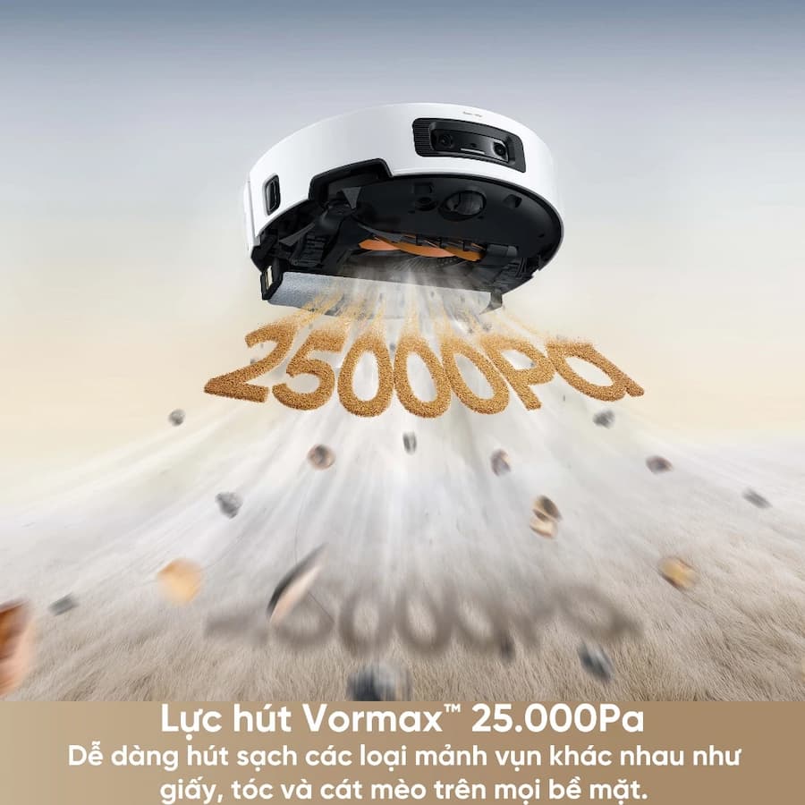🔰 Lực hút Vormax™ 25.000Pa: dễ dàng hút sạch các loại mảnh vụn khác nhau như giấy, tóc và cát mèo trên mọi bề mặt.