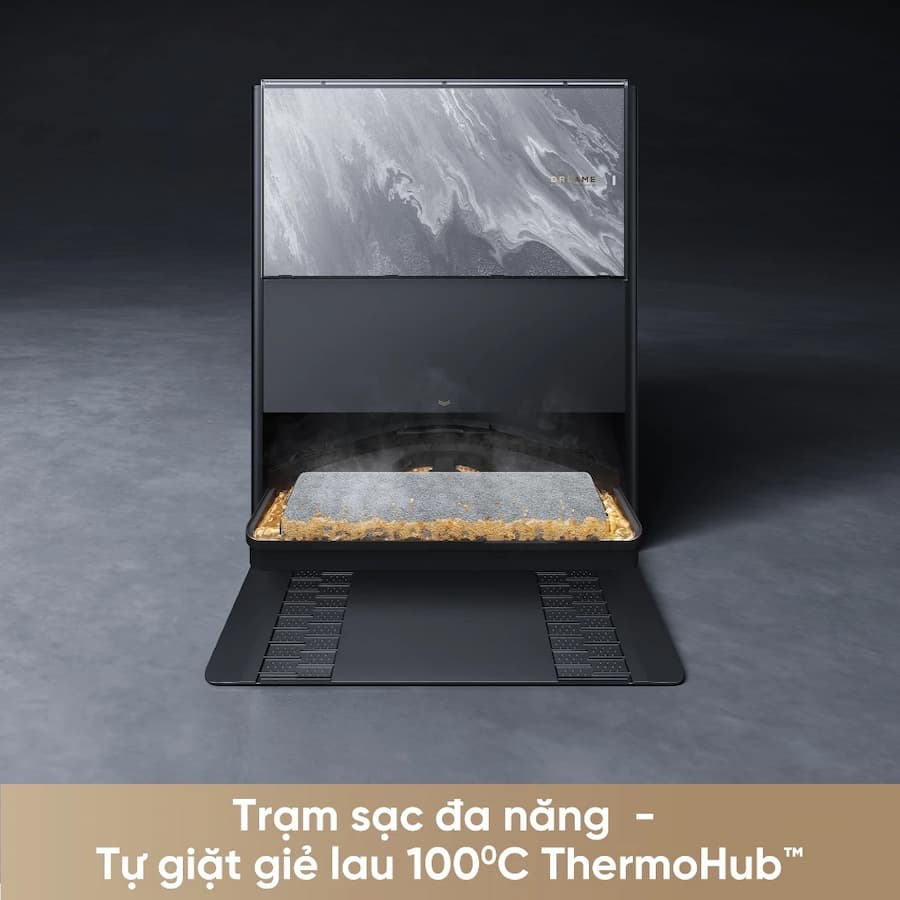 Trạm sạc tích hợp hệ thống tự làm sạch ThermoHub™ 100°C bằng nước nóng. Hệ thống gia nhiệt PTC này có khả năng làm nóng bề mặt giặt giẻ lên 100°C sau mỗi chu trình làm sạch. Nhiệt độ cực cao này được thiết kế để có thể loại bỏ dầu mỡ cứng đầu và bụi bẩn bám lâu ngày, đồng thời cung cấp khả năng khử trùng đáng kể bằng cách ngăn chặn vi khuẩn và mùi hôi, từ đó giảm thiểu lây nhiễm chéo giữa các khu vực làm sạch. Hệ thống sẽ tự động làm mát sau quá trình giặt để đảm bảo an toàn cho người dùng. Việc đạt đến 100°C để giặt giẻ lau thể hiện một bước nhảy vọt đáng kể về khả năng vệ sinh, vượt trội so với các đối thủ cạnh tranh thường chỉ đạt 70-75°C.