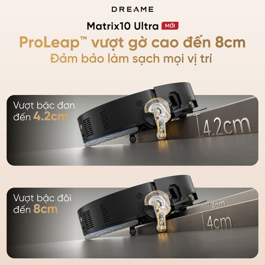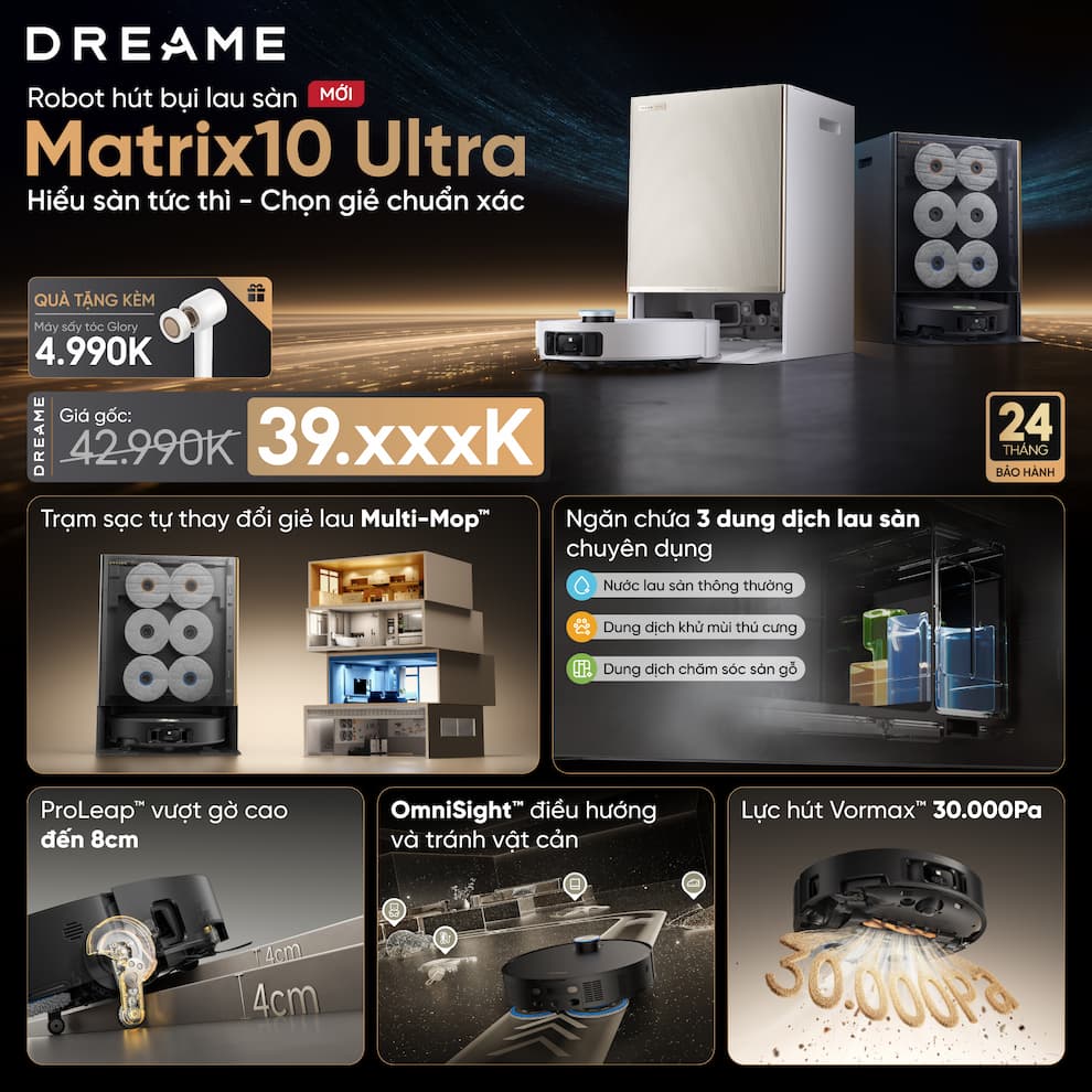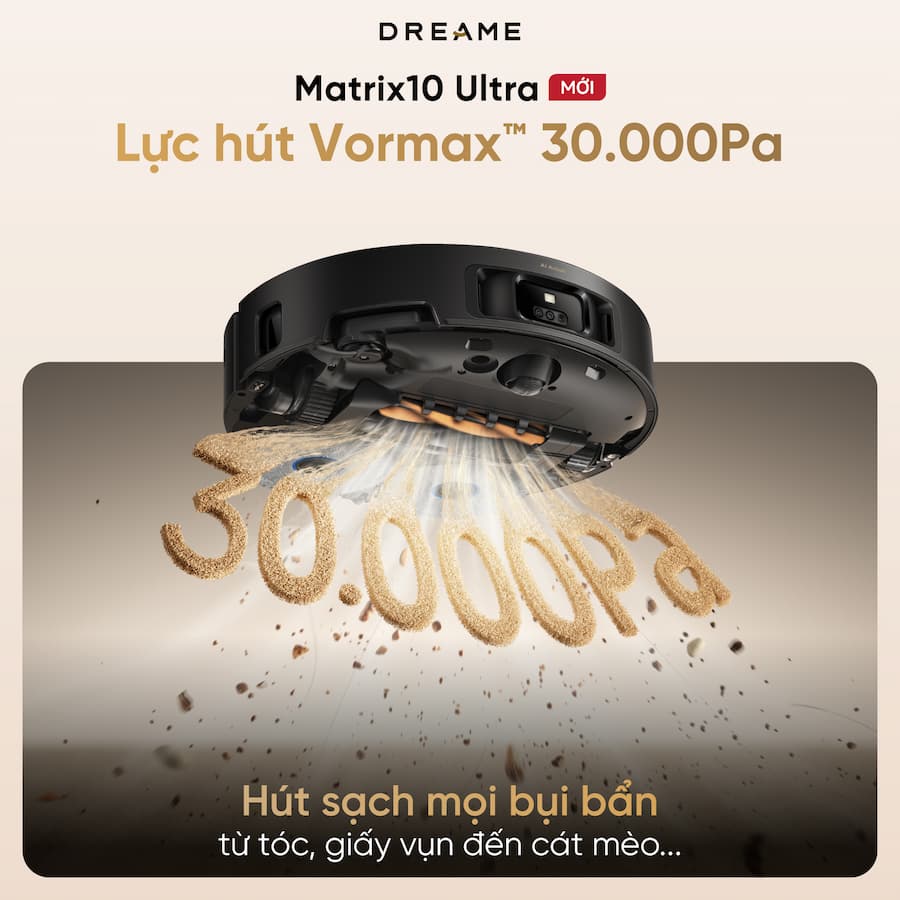 -18%Robot hút bụi lau nhà Dreame Matrix10 Ultra là một dòng sản phẩm cao cấp, tích hợp nhiều công nghệ đột phá, được thiết kế để mang lại giải pháp làm sạch toàn diện và tự động. Khẳng định sự khác biệt, giữ vững thế độc tôn công nghệ, Dreame chính thức ra mắt Matrix10 Ultra - robot hút bụi thông minh với công nghệ thay giẻ độc quyền: Trạm sạc đa năng Muitl-Mop™: tự động thay đổi giẻ lau phù hợp với mặt sàn, làm sạch triệt để từng khu vực. Nâng cấp ngăn chứa nước lau sàn: 3 ngăn - 3 loại nước lau sàn chuyên dụng cho sàn thông thường, khu vực thú cưng, sàn gỗ. ProLeap™ vượt gờ cao đến 8cm: vượt bậc đơn 4.2cm và bậc đối đến 8cm đảm bảo làm sạch mọi vị trí. OmniSight™ điều hướng và tránh vật cản: điều hướng nhạy bén, nhận diện chính xác và tránh đến 240 loại vật cản khác nhau. Lực hút cực đại Vormax™ 30.000Pa: hút sạch mọi bụi bẩn từ tóc, giấy vụn đến cát mèo… Dreame Matrix10 Ultra là một sản phẩm robot hút bụi lau nhà thuộc phân khúc cao cấp, tập trung vào tính năng tự động hóa hoàn toàn và hiệu suất làm sạch vượt trội (đặc biệt là lực hút siêu mạnh và khả năng tự động thay giẻ, giặt giẻ nước nóng 100∘C). Sàn nào, giẻ đó, nhà sạch tối ưu mọi vị trí, mọi ngóc ngách. Bước chân trên sàn thoải mái hơn với Dreame Matrix10 Ultra!