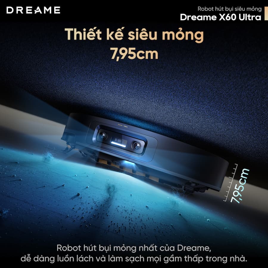 Khó có thể tưởng tượng một "hệ sinh thái đa dạng" đang phát triển ngay dưới gầm tủ nhà bạn: ❌Bụi bẩn kết thành tảng ❌Lông, tóc gom thành cụm ❌Ẩm mốc, vi khuẩn hoành hành. Quá hẹp để tiếp cận, quá tối để nhìn thấy những gì đang diễn ra. Chẳng lẽ đây mãi là "vùng cấm" không thể chạm tay? Siêu phẩm mới Dreame X60 Ultra - Robot hút bụi siêu mỏng chính thức ra mắt - xóa bỏ hoàn toàn định nghĩa "vùng cấm" trong nhà. Robot hút bụi lau sàn chuyên dụng Dreame X60 Ultra với thiết kế siêu mỏng 7,95cm cùng cảm biến thông minh DToF giúp robot dễ dàng di chuyển vào không gian thấp, làm sạch toàn diện không gian sống nhà bạn. Trạm sạc đa năng mang đến trải nghiệm bảo trì rảnh tay như: Tự động đổ bụi, tự làm sạch giẻ lau, giảm thiểu nhiều công đoạn làm sạch thủ công phức tạp.