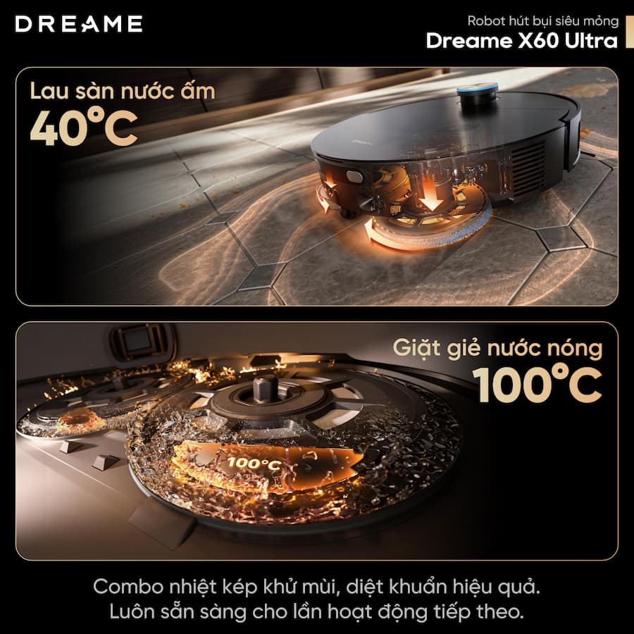 Giặt giẻ nước nóng 100°C (ThermoHub™): Nhiệt độ sôi giúp diệt khuẩn 99.9% và đánh tan vết dầu mỡ.