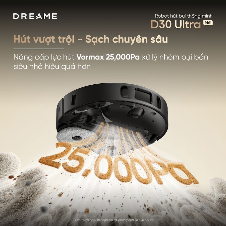 Sự khác biệt rõ rệt nhất của Robot hút bụi lau sàn Dreame D30 Ultra chính là lực hút 25.000Pa (sử dụng động cơ TurboForce thế hệ thứ 6).