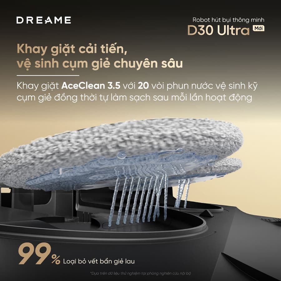 Hệ thống này tạo ra luồng xoáy nước mạnh để loại bỏ vết bẩn trên giẻ hiệu quả hơn, đảm bảo robot luôn lau nhà bằng giẻ sạch nhất. Sau đó, giẻ được sấy khô bằng khí nóng 50°C để triệt tiêu mùi hôi và vi khuẩn.
