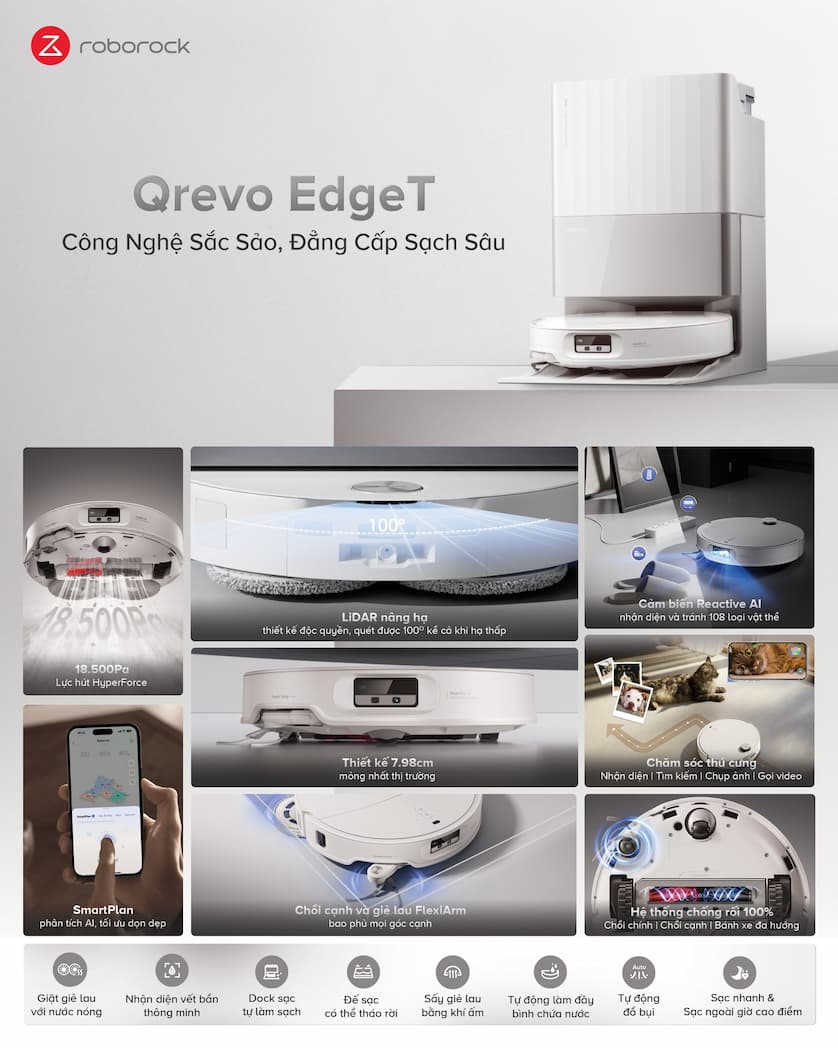 Qrevo EdgeT là một phần của dòng sản phẩm Qrevo đang phát triển của Roborock, bao gồm nhiều mẫu khác nhau như Qrevo 5AE, Qrevo S và Qrevo Curv. Sự tồn tại của các biến thể này cho thấy Roborock đang áp dụng chiến lược phân cấp sản phẩm, cung cấp các tính năng và mức giá khác nhau để đáp ứng nhu cầu đa dạng của người tiêu dùng. Với lực hút HyperForce® 18.500 Pa "dẫn đầu ngành" và khung gầm AdaptiLift™ "đầu tiên trong ngành", Qrevo EdgeT rõ ràng được định vị ở phân khúc cao cấp hơn trong dòng sản phẩm này. Điều này khác biệt đáng kể so với các mẫu như Qrevo 5AE, vốn có lực hút 12.000 Pa và giẻ lau "thò thụt". Việc phân biệt này cho phép Roborock phục vụ nhiều đối tượng khách hàng, từ những người tìm kiếm giải pháp cơ bản đến những người muốn có hiệu suất và tính năng tối đa. Đối với người tiêu dùng, điều quan trọng là phải hiểu rõ các tính năng cụ thể của mẫu "Edge" để đảm bảo rằng nó đáp ứng đúng nhu cầu của họ, vì không phải tất cả các sản phẩm trong "Dòng Qrevo" đều cung cấp cùng một khả năng tiên tiến. Đặc điểm nổi bật:
