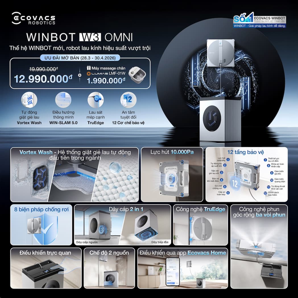 Robot lau kính Ecovacs Winbot W3 Omni nổi bật nhờ công nghệ giặt khăn lau Vortex Wash, khả năng tự làm sạch trạm, khăn lau giữ nước tốt giúp duy trì hiệu quả làm sạch liên tục. Cáp đa năng hai trong một tích hợp dây nguồn cùng dây an toàn hỗ trợ chống rơi, tăng độ ổn định khi hoạt động. Thiết bị hỗ trợ cả chế độ cắm điện lẫn dùng pin, phù hợp nhiều không gian khác nhau. Công nghệ TruEdge lau sát mép kính, hạn chế bỏ sót, trong khi thuật toán WIN-SLAM 5.0 đảm nhiệm điều hướng chính xác. Hệ thống phun nước góc rộng ba vòi kết hợp cây lau ướt nâng cao khả năng xử lý vết bẩn. Người dùng có thể điều khiển đa hướng thông qua ứng dụng ECOVACS HOME, kết nối nhanh chóng. Hệ thống bảo vệ 12 lớp tăng độ an toàn trong quá trình vận hành, đi kèm thông báo đa ngôn ngữ cùng hướng dẫn bằng giọng nói giúp kiểm soát thiết bị dễ dàng. Khám phá thêm loạt tính năng cao cấp mang đến trải nghiệm làm sạch đúng nghĩa: