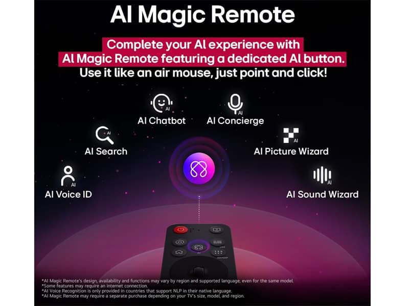 Hệ điều hành WebOS 25 và AI Magic Remote: TV sử dụng hệ điều hành WebOS mới nhất, giao diện trực quan, dễ sử dụng. Điều khiển AI Magic Remote thế hệ mới có khả năng tìm kiếm giọng nói bằng tiếng Việt và con trỏ chuột ảo, giúp thao tác tiện lợi hơn.