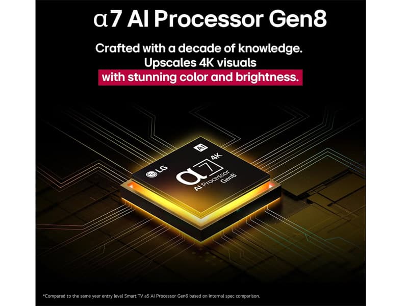Độ phân giải 4K và bộ xử lý α7 AI 4K Gen8: Với độ phân giải 4K (3840 x 2160 pixel) và bộ xử lý AI α7 thế hệ thứ 8, TV có khả năng xử lý hình ảnh mạnh mẽ. Công nghệ 4K Super Upscaling giúp nâng cấp các nội dung có độ phân giải thấp lên gần chuẩn 4K, mang lại hình ảnh sắc nét và chi tiết hơn.