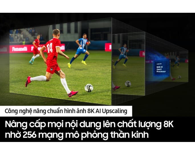 Công nghệ 8K AI Upscaling: Nâng cấp mọi nội dung đầu vào, kể cả từ nguồn 4K hoặc thấp hơn, lên gần chuẩn chất lượng 8K, mang đến trải nghiệm xem mượt mà và sắc nét chưa từng có. Công nghệ nâng cấp hình ảnh 8K AI Upscaling hỗ trợ bởi AI với 256 mạng mô phỏng thần kinh giúp bạn thưởng thức tất cả nội dung 8K sống động. Cùng bộ xử lý AI NQ8 thế hệ 2 mang lại khung hình sắc nét và mượt mà nhất từng có trên TV Samsung.