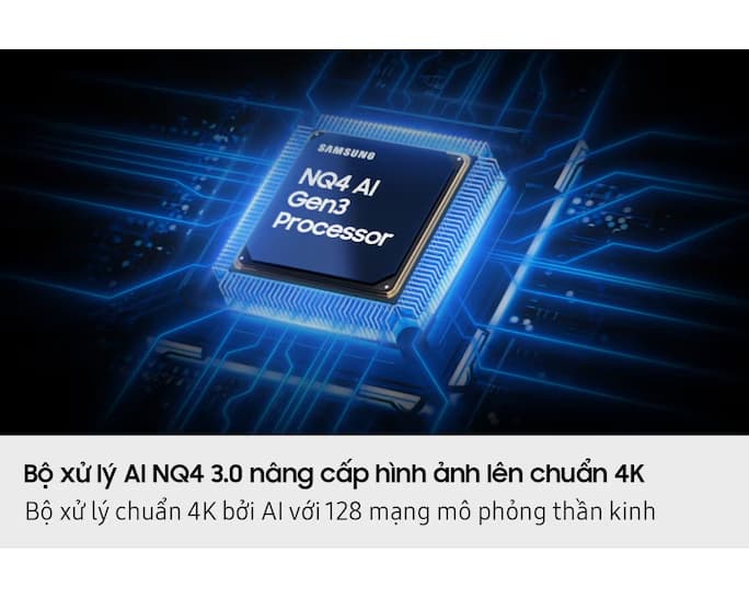 Bộ xử lý AI NQ4 3.0: Đây là bộ xử lý mạnh mẽ nhất của Samsung, sử dụng 128 mạng trí tuệ nhân tạo để nâng cấp hình ảnh và âm thanh. Mọi nội dung, kể cả nguồn phát có độ phân giải thấp, đều được nâng cấp lên gần chuẩn 4K, mang lại trải nghiệm xem rõ nét và chi tiết.