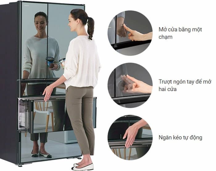 Cửa và ngăn kéo tự động (Auto Door): Hai cánh cửa ngăn mát có nút cảm ứng chạm mở, hoặc trượt mở cả hai cửa; ngăn đông và ngăn rau quả có cửa điện trợ lực, giúp việc mở cửa nhẹ nhàng, tiện lợi.